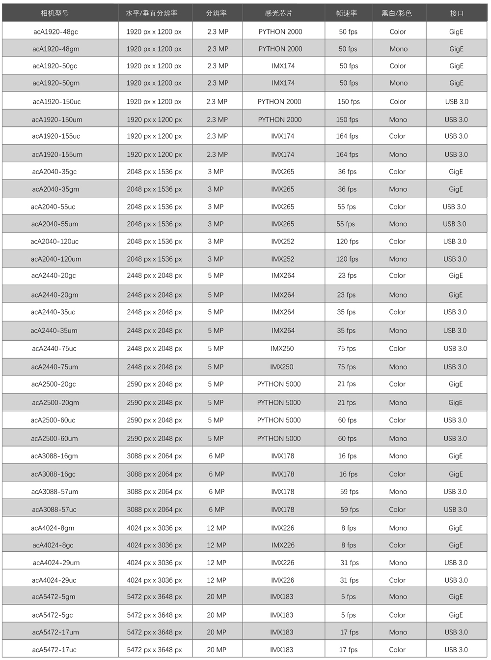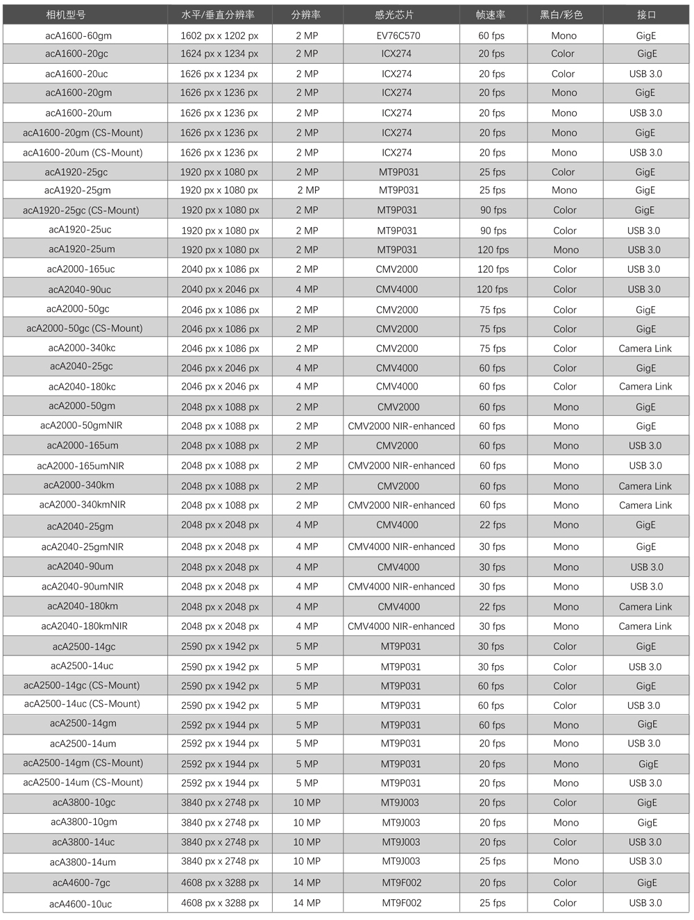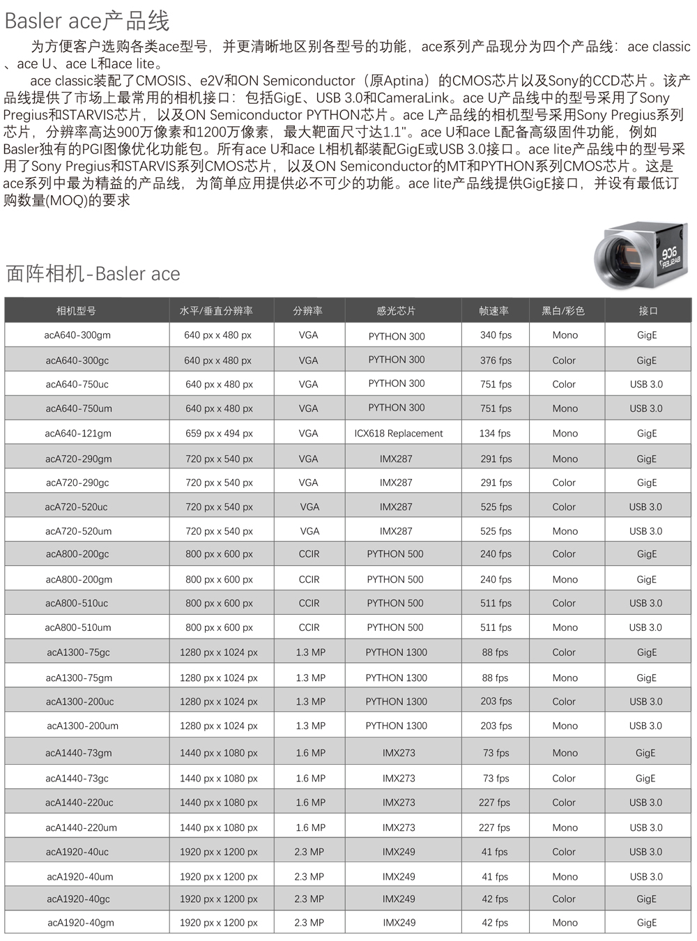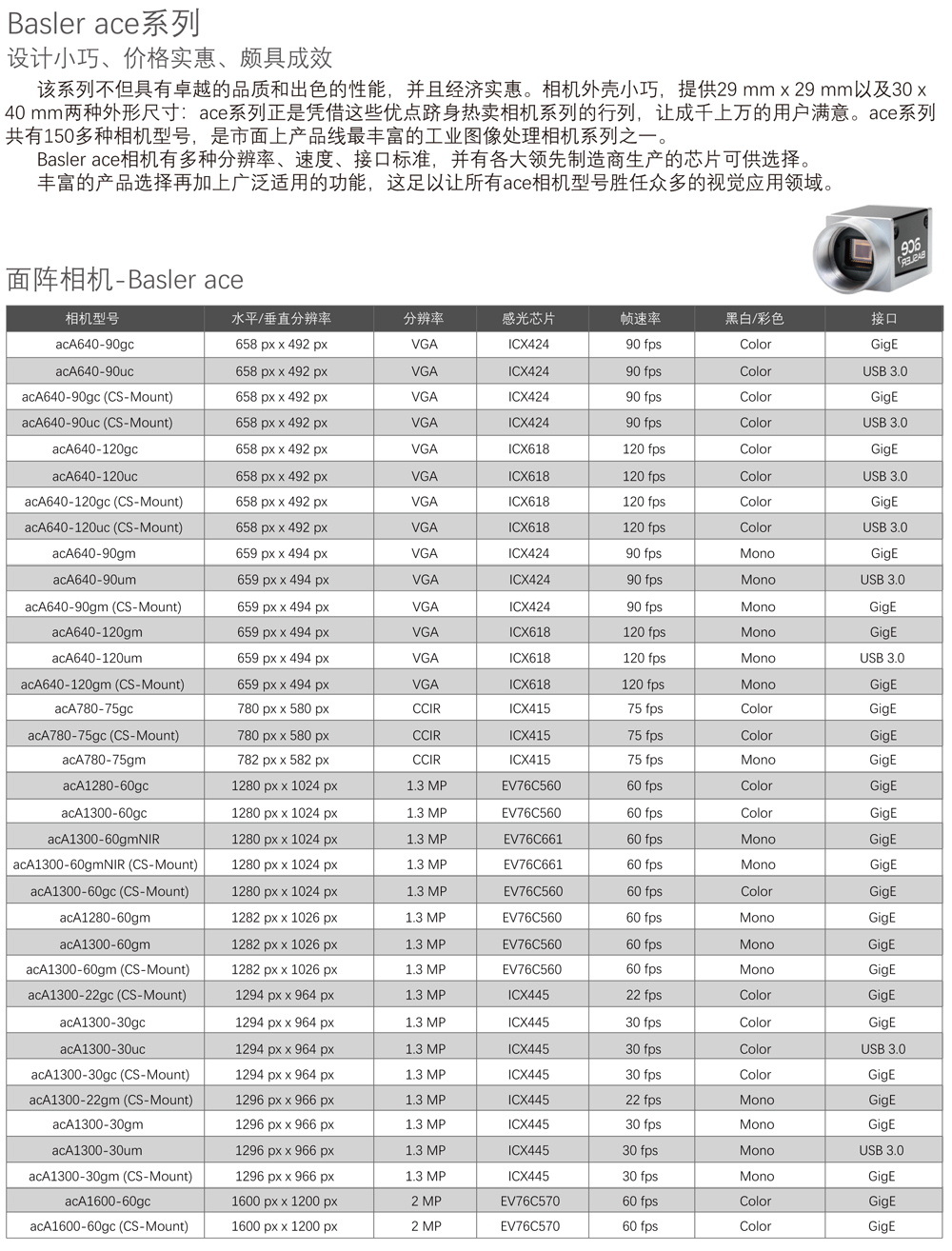 該系列不但具有卓越的品質和出色的性能,并且經濟實惠。相機外殼小巧,提供 29 mm x 29 mm 以及 30x 40 mm 兩種外形尺寸: ace 系列正是憑借這些優點躋身熱賣相機系列的行列,讓成千上萬的用戶 滿意。 ace 系列共有巧15O多種相機型號,是市面上產品線最豐富的工業圖像處理相機系列之一。